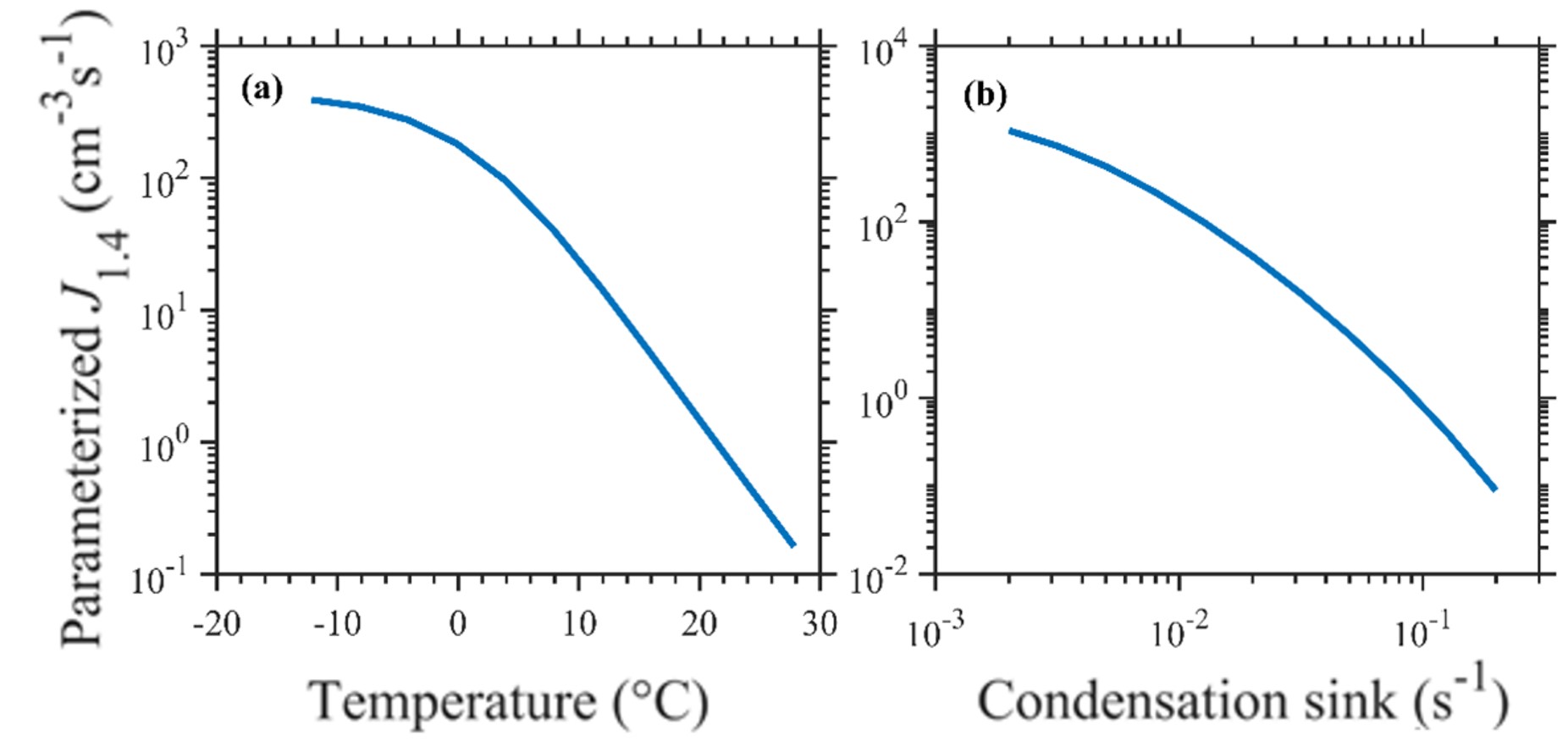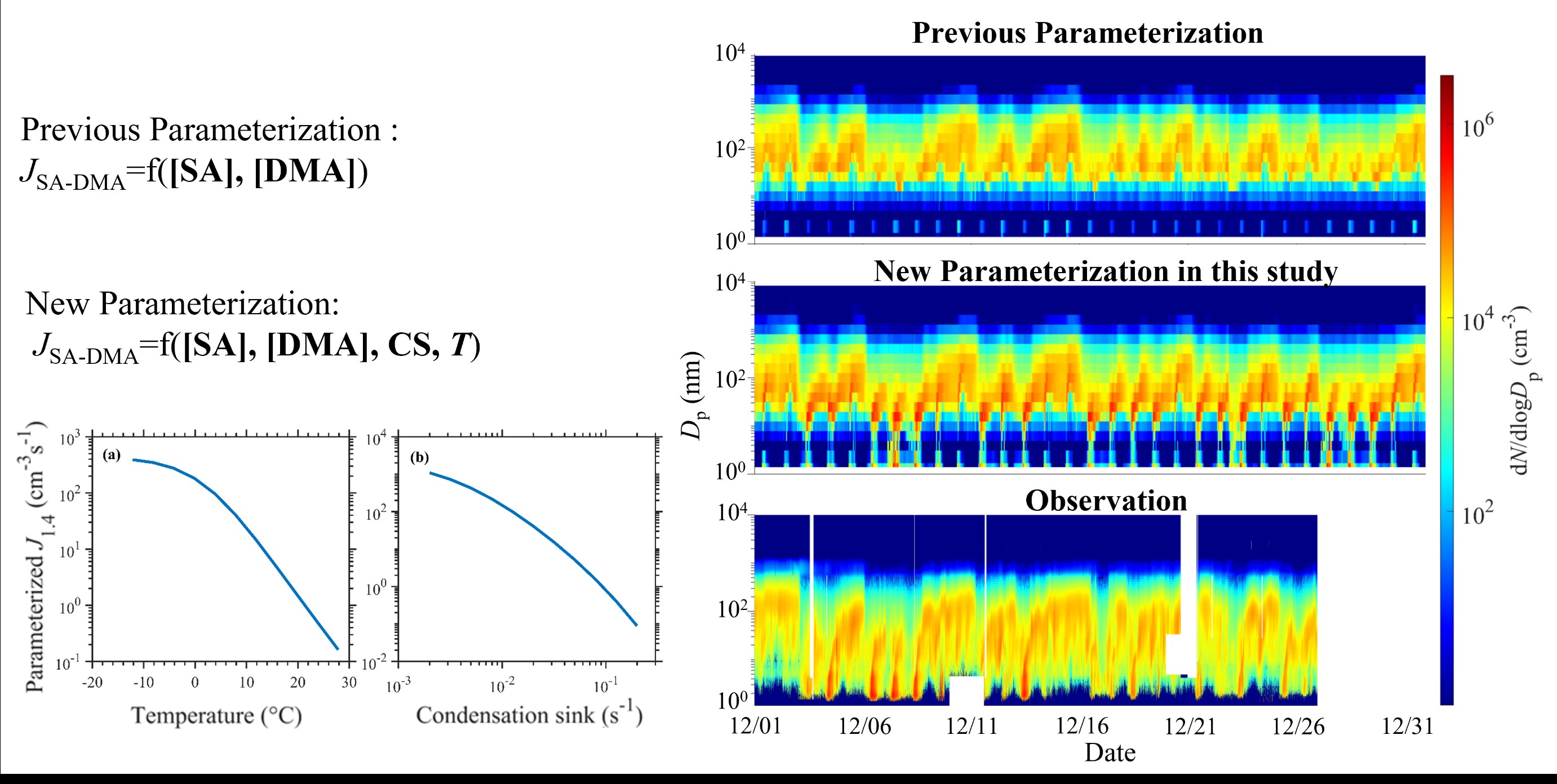 与以往的硫酸-有机胺成核速率参数化方案不同,本研究除了将硫酸、二甲胺的浓度作为参数化方案的自变量外,也将冷凝汇、温度两个参数定量地加入到了新方案中,分别用于表征背景颗粒物去除作用和团簇稳定性对于成核速率的影响。引入这两个参数后,新参数化方案模拟的成核速率与冷凝汇和温度均呈现显著负相关关系,这与以往研究在北京大气观测中的发现一致。(图1)