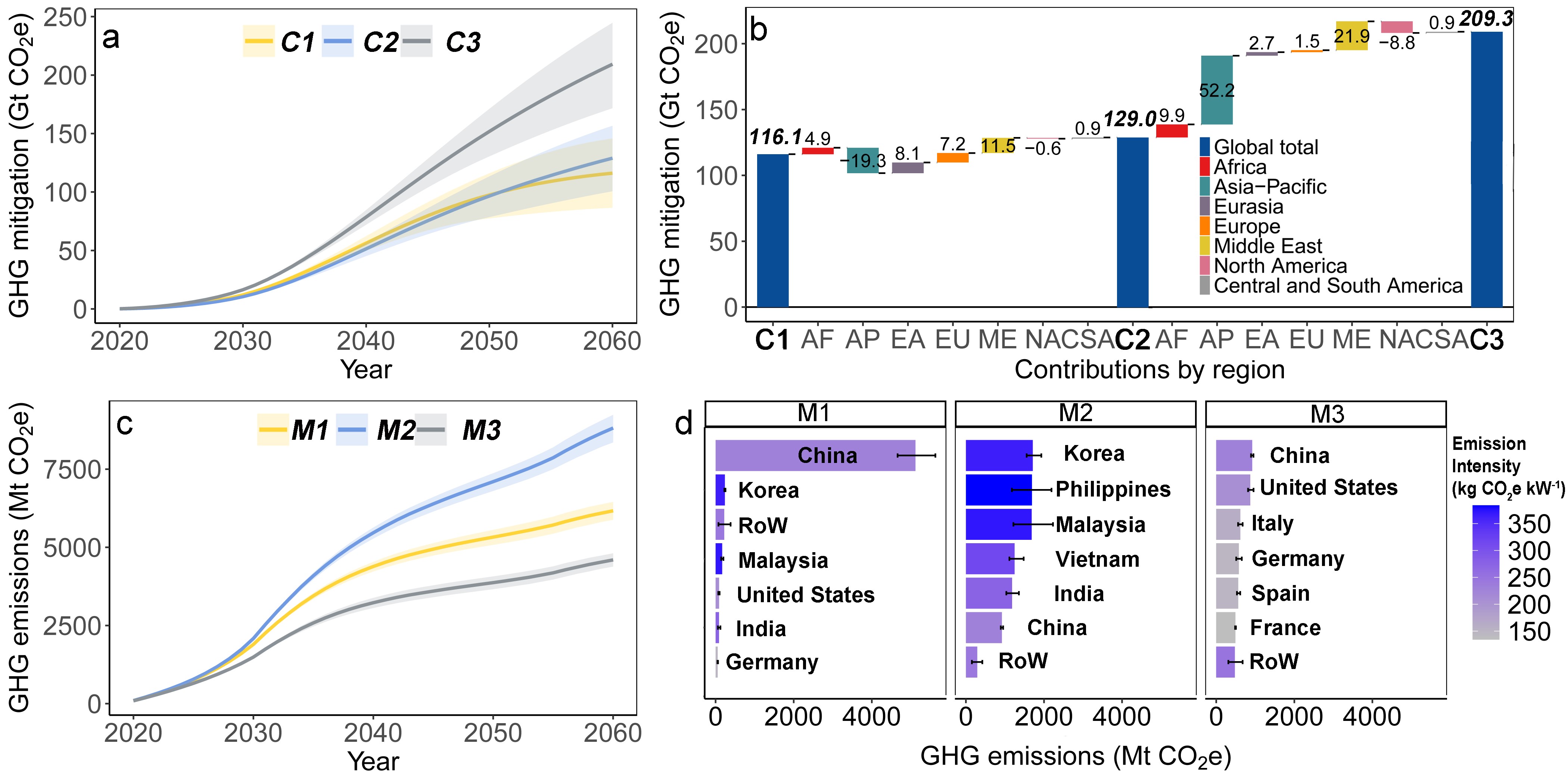 图2.2020-2060年多情景全球太阳能光伏发电排放与减排的时空变化。(a)累计减排量;(b)各装机情景减排量差异及区域贡献;(c)累计排放量;(d)各生产情景产业链排放的国别贡献