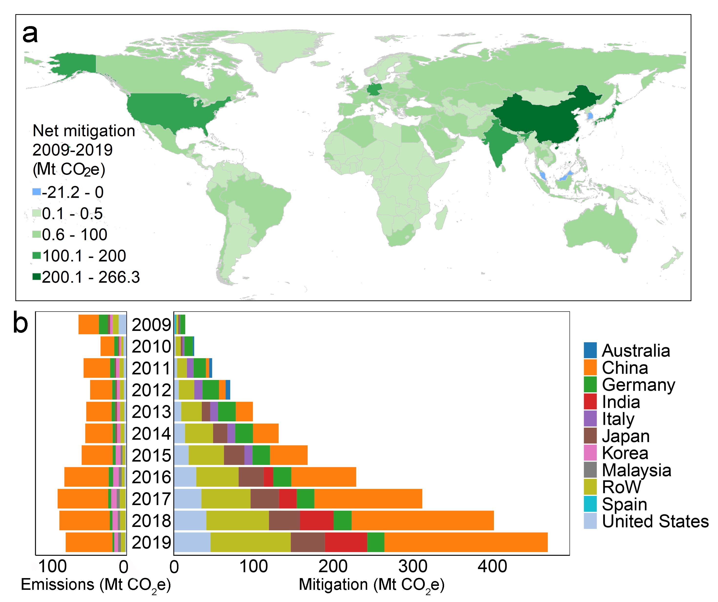 图1.全球太阳能光伏发电净减排空间分布差异显著。(a)2009-2019年净减排效果的国别分布特征;(b)2009-2019年全球减排与排放的变化趋势及主要贡献国家
