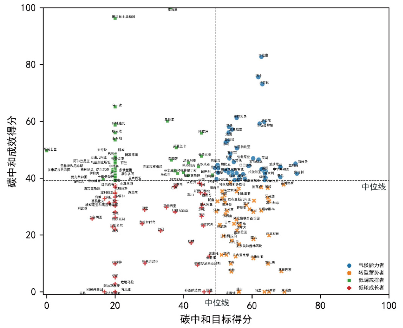 “转型蓄势者”——碳中和目标高,但脱碳成效低。该类别下主要是发展中国家,虽然承诺了较具有雄心的碳中和目标,但在资金和技术方面的进展有待加强。