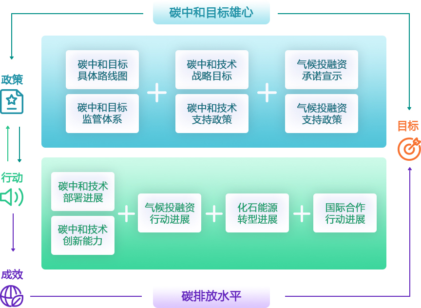 为了更好地定量评估各国碳中和进展,本报告构建了“目标-政策-行动-成效”指标体系(如下图所示),将上述数据库的指标归一化后加权汇总形成四项百分制分数,分别表征各国在目标制定、政策设计、零碳行动和减排成效上的成就。
