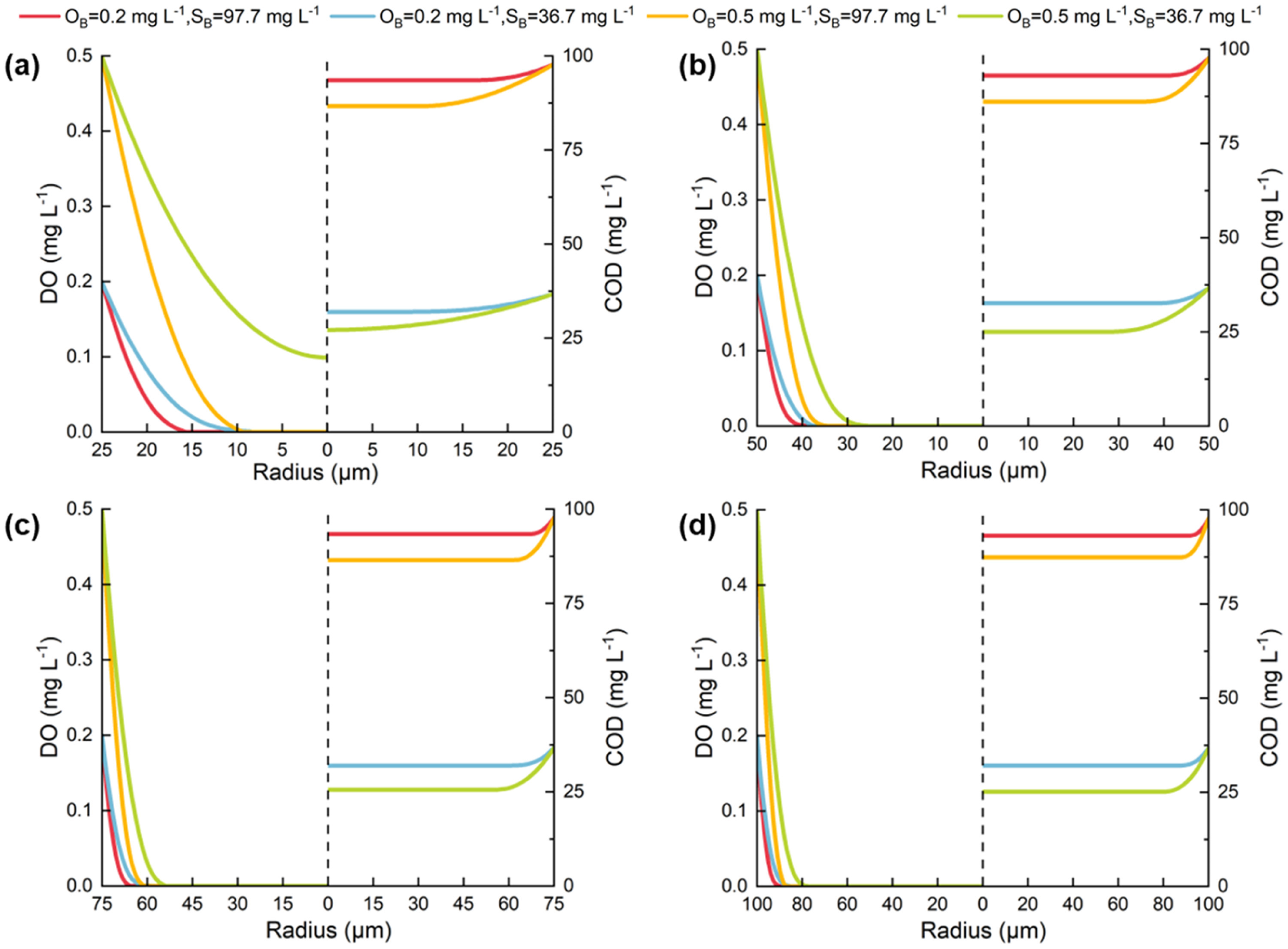 图2. 微氧池中半径为(a) 25μm、(b) 50μm、(c) 75μm和(d) 100μm的污泥中DO和COD的分布