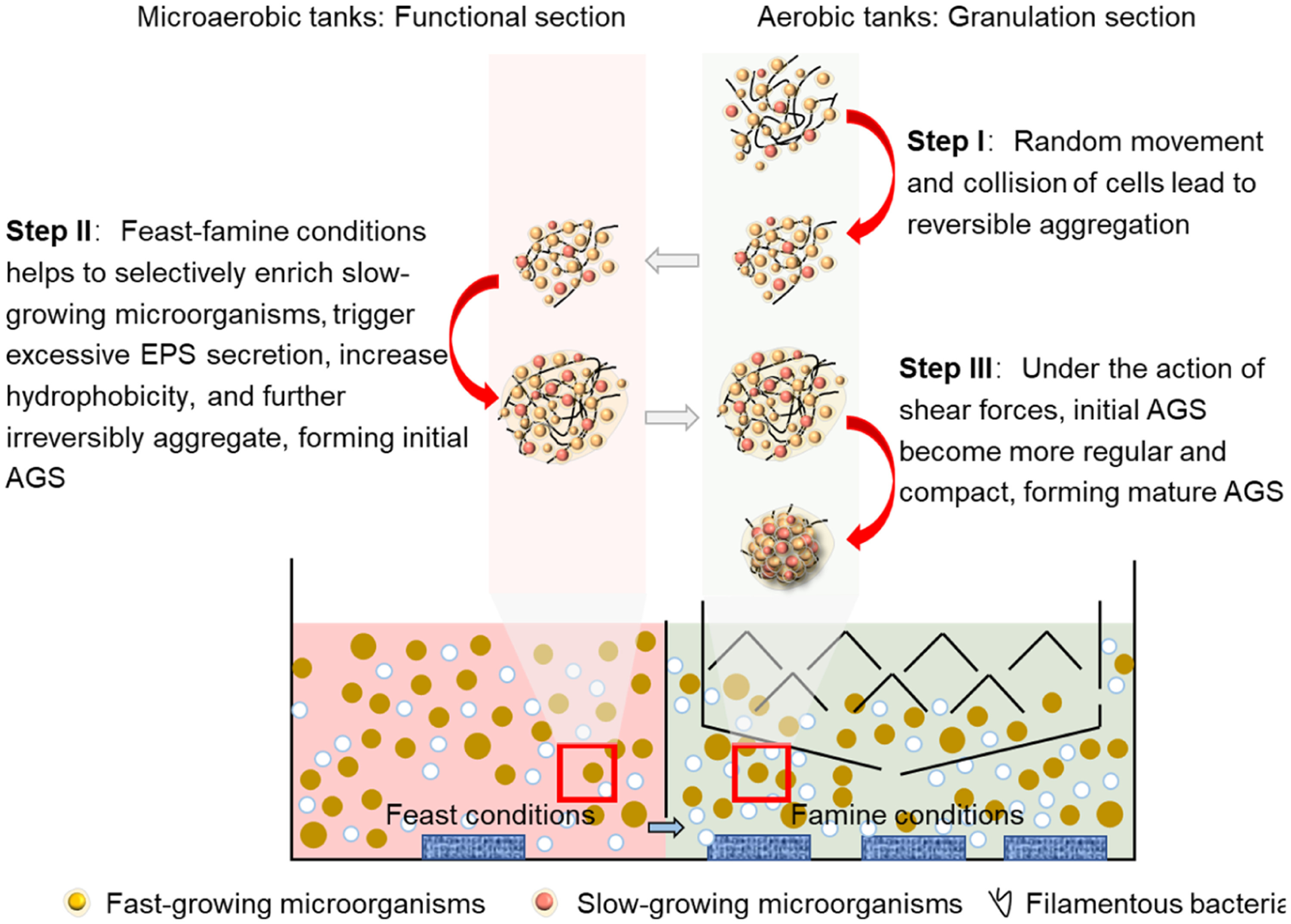 研究通过计算流体动力学-群体平衡模型和COD降解曲线发现微氧-好氧耦合沉淀反应器构型为颗粒化提供了必要的水力剪切力和丰盛-饥饿条件,并提出了微氧-好氧耦合沉淀反应器内的颗粒化机理(图3)。阶段I:颗粒污泥前体形成阶段,机理是基于剪切的聚集生长,在好氧池中,水流和曝气形成良好的混合条件,增加了微生物的随机运动和碰撞,逐渐形成聚集体,即颗粒污泥的前体;阶段II:选择性培养功能微生物阶段,当污泥回流到基质浓度相对较高,即丰盛的微氧池后,慢速生长的微生物如聚磷菌(PAOs)、DPAOs在有利的选择压下富集生长;阶段III:循环往复的成熟阶段,通过在缺氧和好氧环境条件下(不同基质浓度条件和剪切力)循环,好氧颗粒污泥前体不断生长,在好氧池水力剪切力的作用下,初始的颗粒污泥变得更加规则和致密,形成功能成熟的好氧颗粒污泥。
