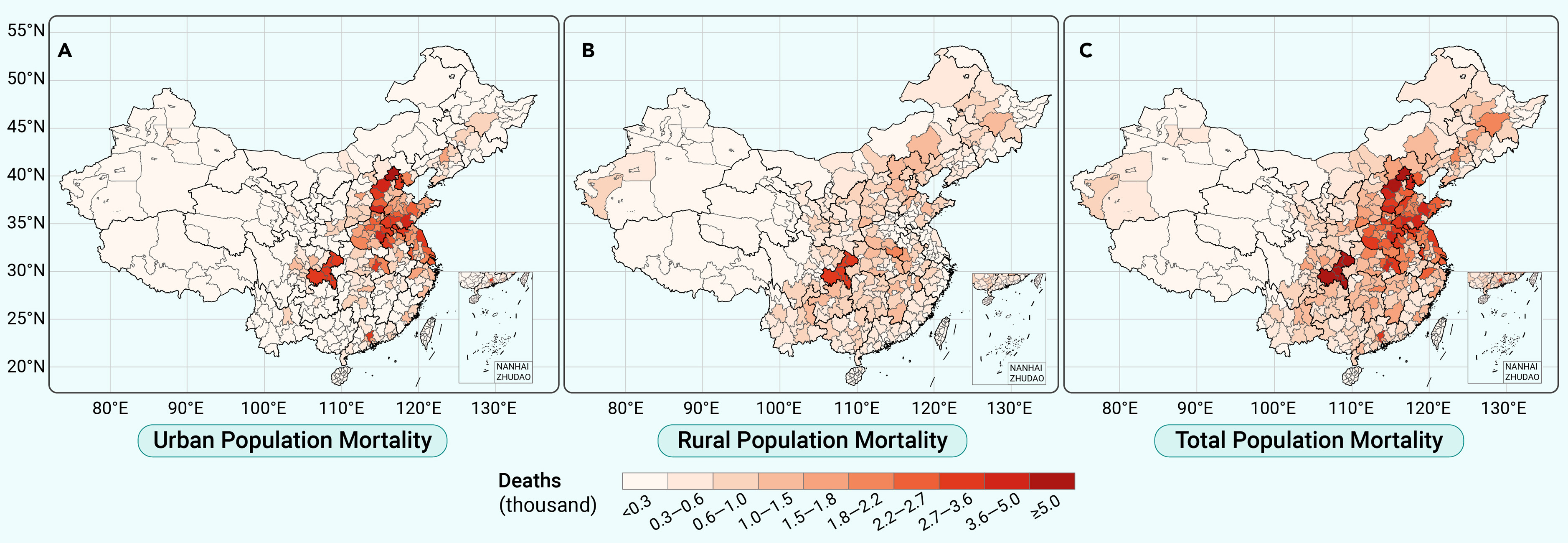 A. 城市死亡人数;B. 农村死亡人数;C. 总人口死亡人数