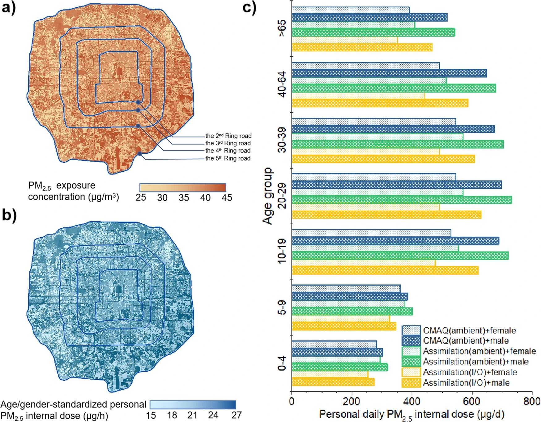 a) 室内外PM2.5浓度分布; b) 年龄/性别标准化的个人每小时PM2.5内暴露分布; c) 各年龄与性别亚组的平均每日PM2.5内暴露量