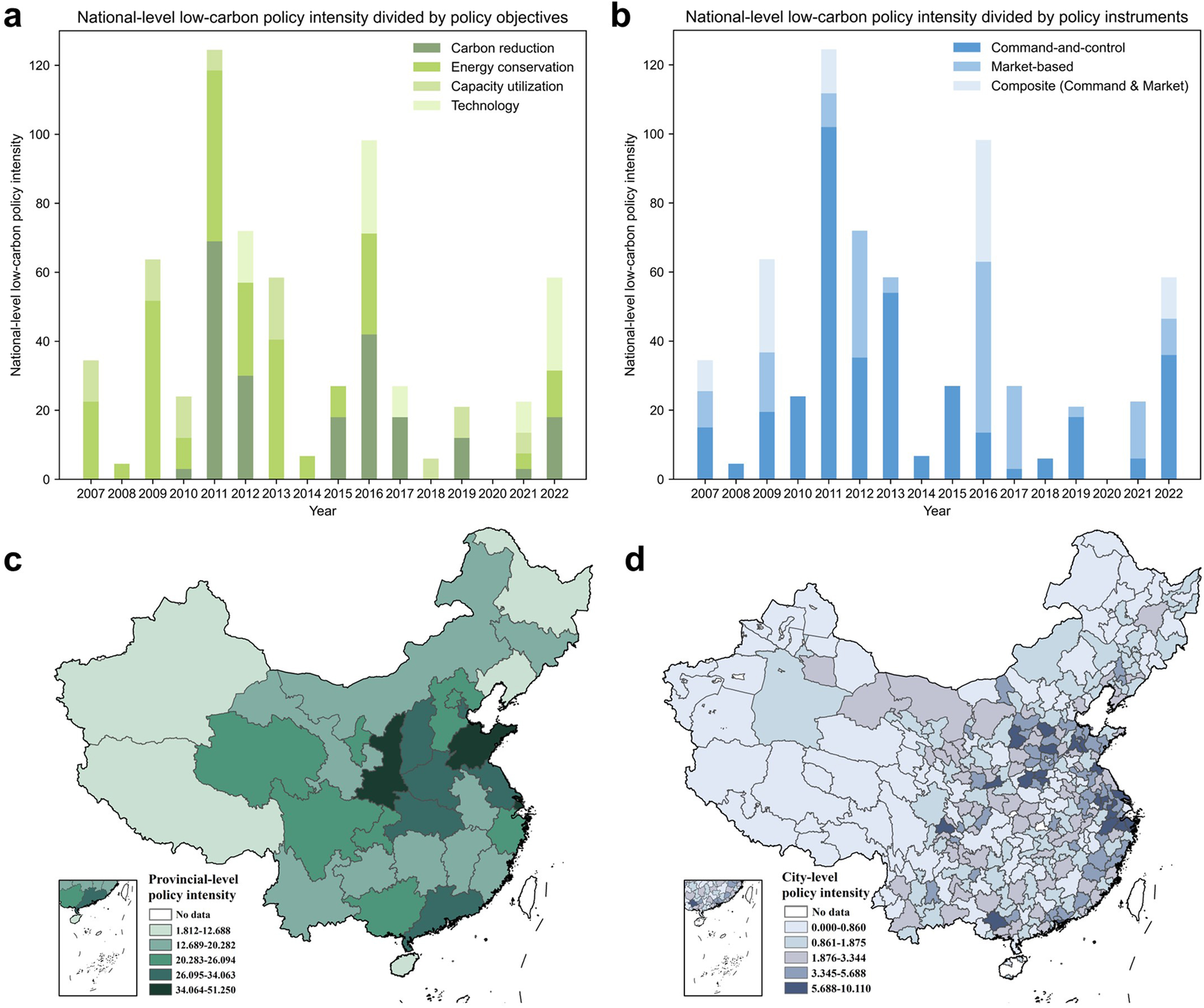 江南网页版2024年2月23日电(通讯员 董馨阳)江南网页版王灿教授课题组发布了2007-2022年中国国家级至地级市级低碳政策强度数据集(“China’s low-carbon policy intensity dataset from national- to prefecture-level over 2007–2022”)。该数据集量化评估了覆盖中国国家级、31个省级、334个地级市级共7282条低碳政策的强度,并将政策强度聚合得到包含三类政策层级、四类政策目标和三类政策工具的子指数。通过与宏观和微观数据相结合,该研究成果可以为低碳政策量化评估、低碳政策制定等领域提供数据支撑。