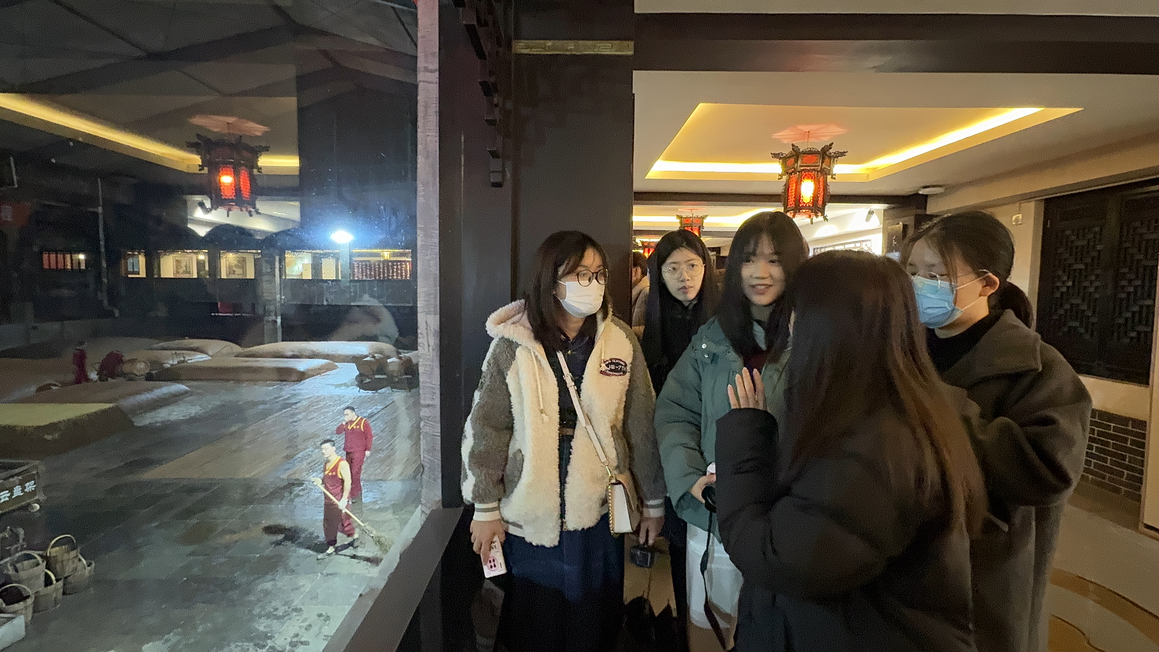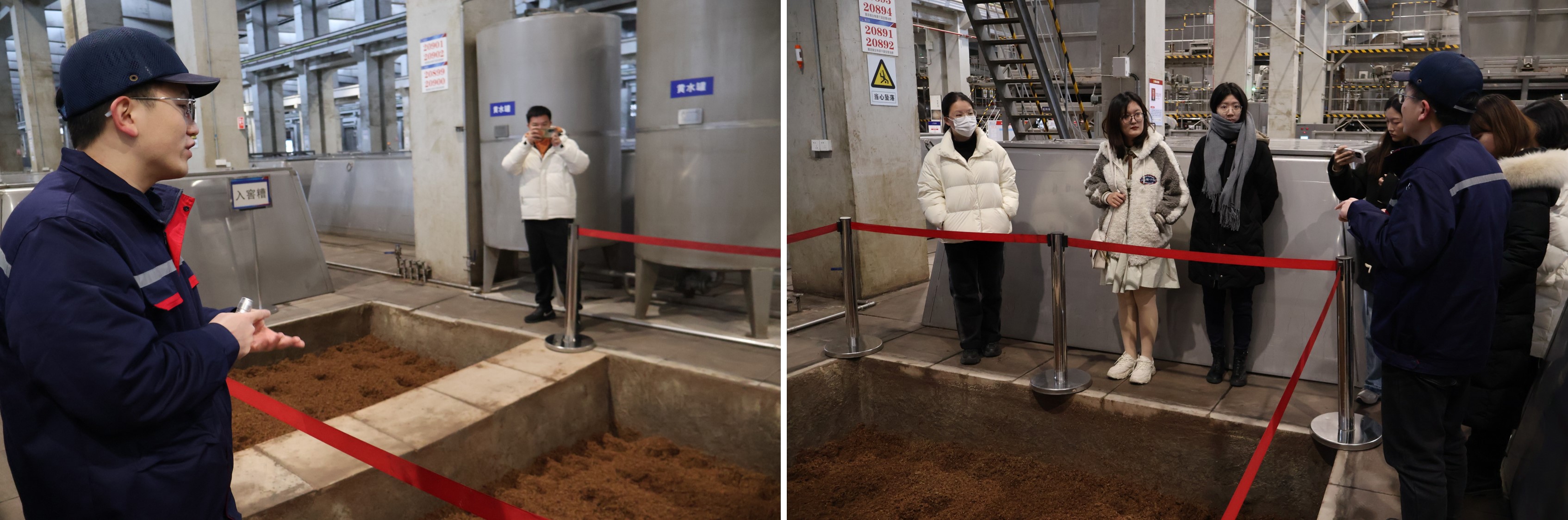 1月21日下午,成员们来到1573国宝窖池群,近距离观看了泸州老窖传统酿造工艺流程,了解了窖池的工作原理,并聆听讲解员介绍了泸州老窖的发展起源。同学们了解到,至今1573国宝窖池群酒糟中的微生物种群已传承了451年,种群数量高达一千余种,是现存最古老的窖池。