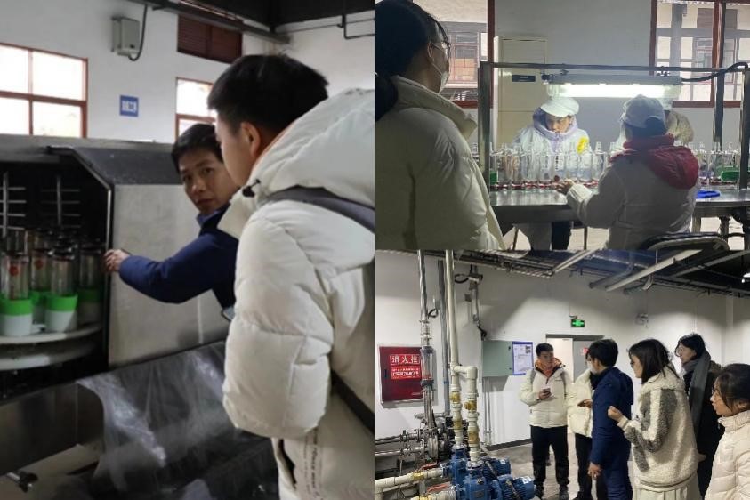 1月23日,在泸州老窖黄舣包装中心的白酒灌装生产线,支队成员充分调研了“洗瓶水”这一酿酒废水的特性,以及在处理过程中面临的瓶颈。经工作人员介绍,洗瓶水是指冲洗酒瓶所产生的废水,具有产生量大、碳氮比低、COD浓度整体偏低但不稳定等特点,既不能直接排入水体,也不适合排入市政污水管道,否则会增加污水处理厂的负荷并降低其进水的可生化性。同学们调研了解到,该生产线把经过膜处理的部分洗瓶水回用至三次洗瓶工艺中的首次冲洗,实现了部分洗瓶水的循环利用。与此同时,同学们注意到,目前洗瓶水在排入管道前会先进行预处理,但处理后仍存在水质不完全达标的问题,因此不能直接排入水体。