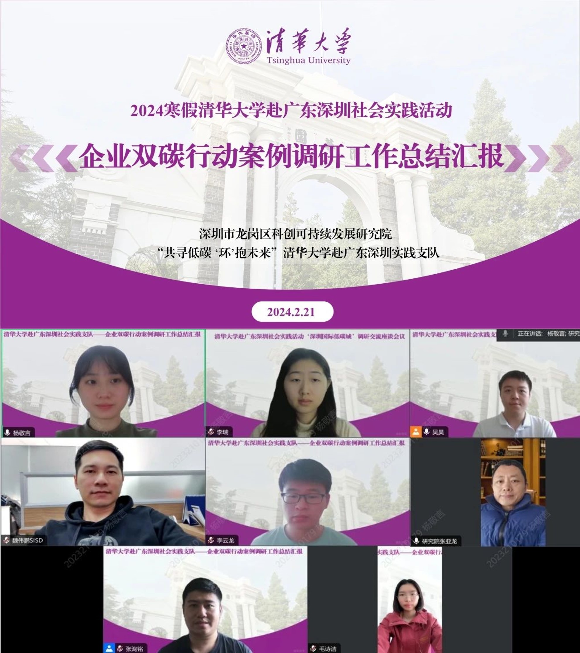 在实地调研与座谈研讨后,支队成员结合自身专业课题背景,开展了文献调研、案例分析、报告撰写等工作,对“近零碳”社区、零碳公园、企业低碳生产园区和绿色低碳建筑等多个低碳场景的建设规划理念、技术应用、运营策略及发展模式进行了系统分析与经验模式总结,并针对调研中发现的问题提出解决建议。2月21日,支队成员毛诗洁和吴昊代表支队分别向深圳可持续发展研究院汇报了对深圳国际低碳城、深圳大梅沙万科中心的调研成果。