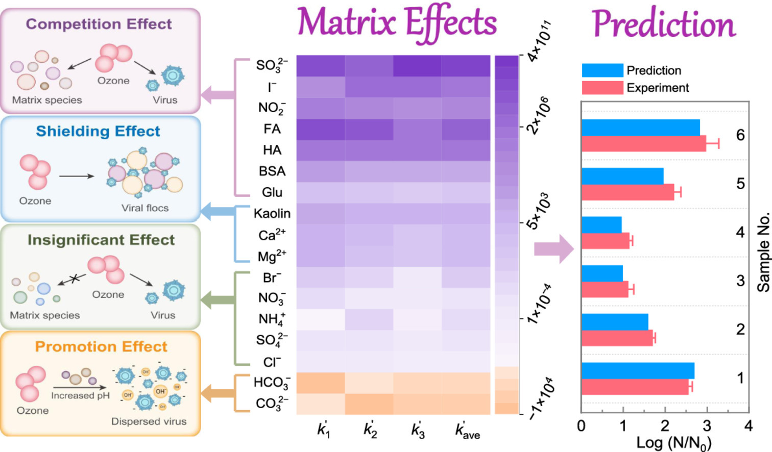 图1. 污水基质对臭氧灭活水中病毒的影响机制、量化比较以及模型预测