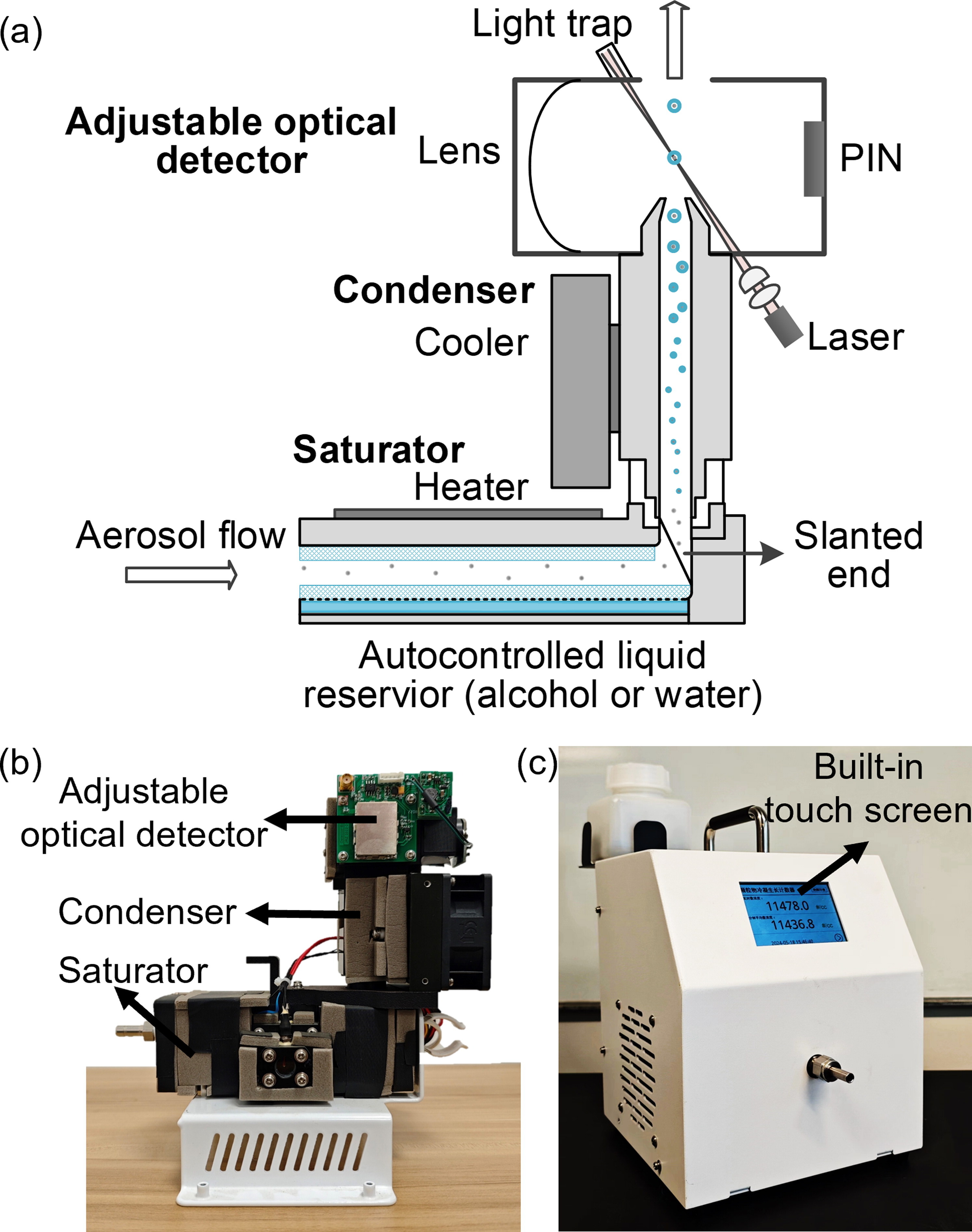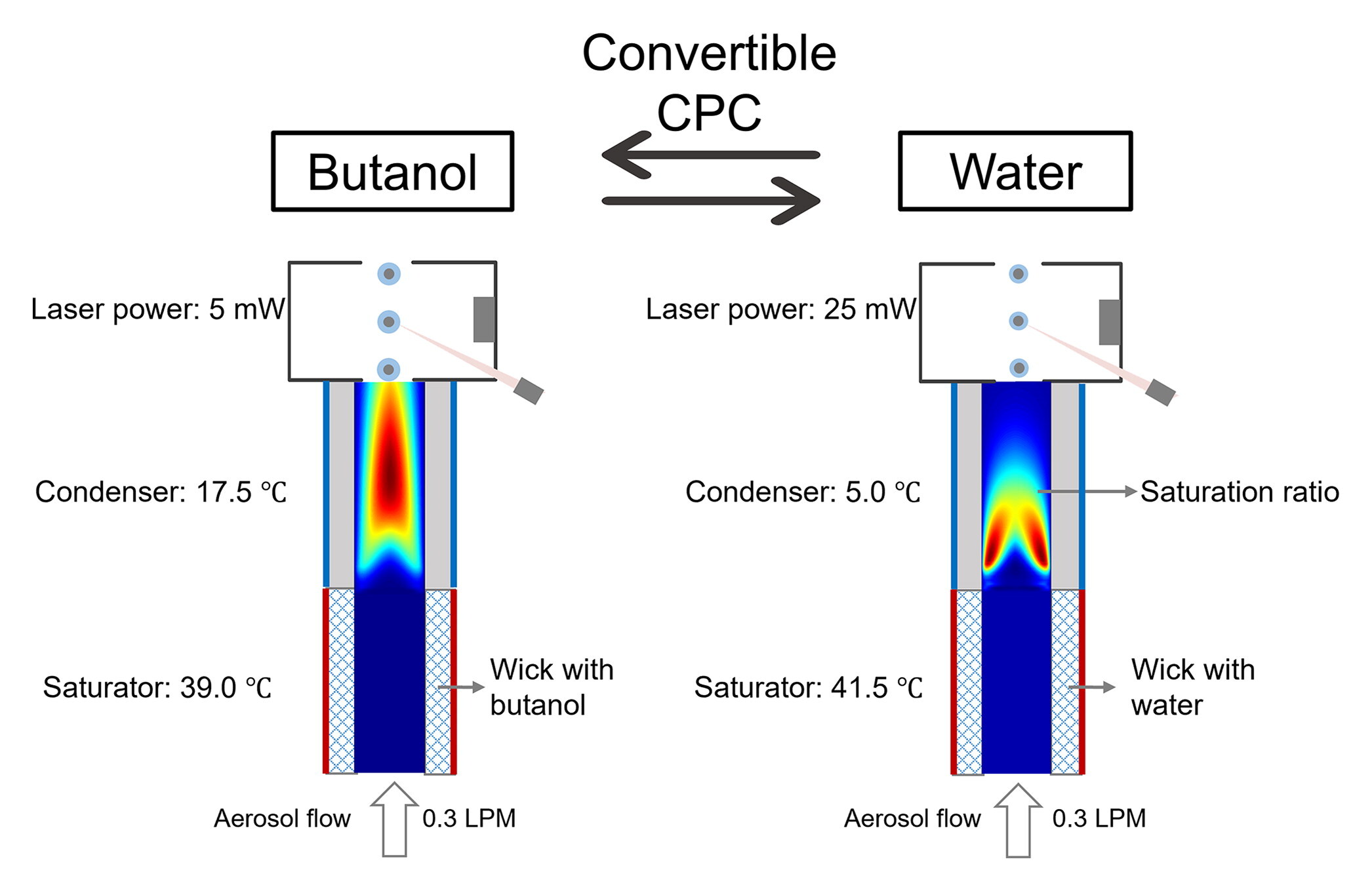 CPC在颗粒物飞行过程中将过饱和蒸汽冷凝在其表面,使之长大成为微米级液滴,并在线通过光学检测器实现颗粒物计数。该仪器广泛适用于环境监测、机动车尾气检测、净化过滤、工业环境监测等领域。CPC产生蒸气的工作液体通常有正丁醇、异丙醇、水等。由于醇和水理化性质不同,现有CPC针对不同工作液体使用了不同的结构,分别形成了醇基CPC和水基CPC。醇基CPC易使疏水颗粒物长大,目前使用较为广泛,但会释放醇蒸气,易引入杂质气体。水基CPC易使亲水颗粒物长大,在环境暴露监测、半导体无尘室和无尘工艺检测等领域应用广泛。研制兼容醇和水的通用冷凝粒子计数器有助于实现各应用场景的无缝切换,可根据具体的应用需求和条件选择使用最合适的工作液体。