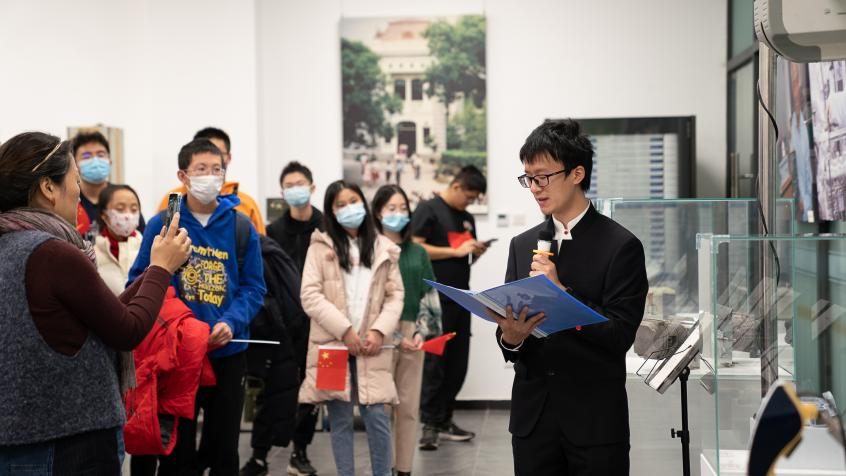 他特别讲到《没有共产党就没有新中国》这首歌。它写于1943年,正值日本帝国主义和国民党反动派联合对解放区实行双重打击,中国共产党领导的抗日战争进入最艰苦时期。“其实当时曹火星在创作时用的名字是《没有共产党就没有中国》,后来毛主席听到后,认为没有中国共产党的时候,中国依然是存在的,所以在中国前面加了一个新字。”此外,“歌词中一开始是坚持抗战六年多,而随着歌曲的广泛传唱,人民自发改变歌词,直到抗战胜利,改为了坚持抗战八年多。”伴随着背景音乐,他将这段故事娓娓道来。