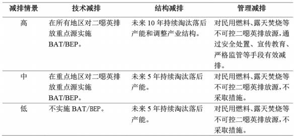 综合分析发达国家二噁英减排的经验,可以通过结构减排、技术减排、管理减排等途径来控制二噁英排放。结构减排指通过产业结构调整、落后产能淘汰等行动,导致二噁英排放源数量减少,进而减少二噁英排放。技术减排指运用先进生产工艺或者实施了 BAT/BEP,导致二噁英排放因子下降,进而减排二噁英排放。管理减排指对不可控的二噁英排放源实施严格监管,导致二噁英减排。表 1 分析了未来 10 年在高中低三种减排情景下的二噁英减排途径。