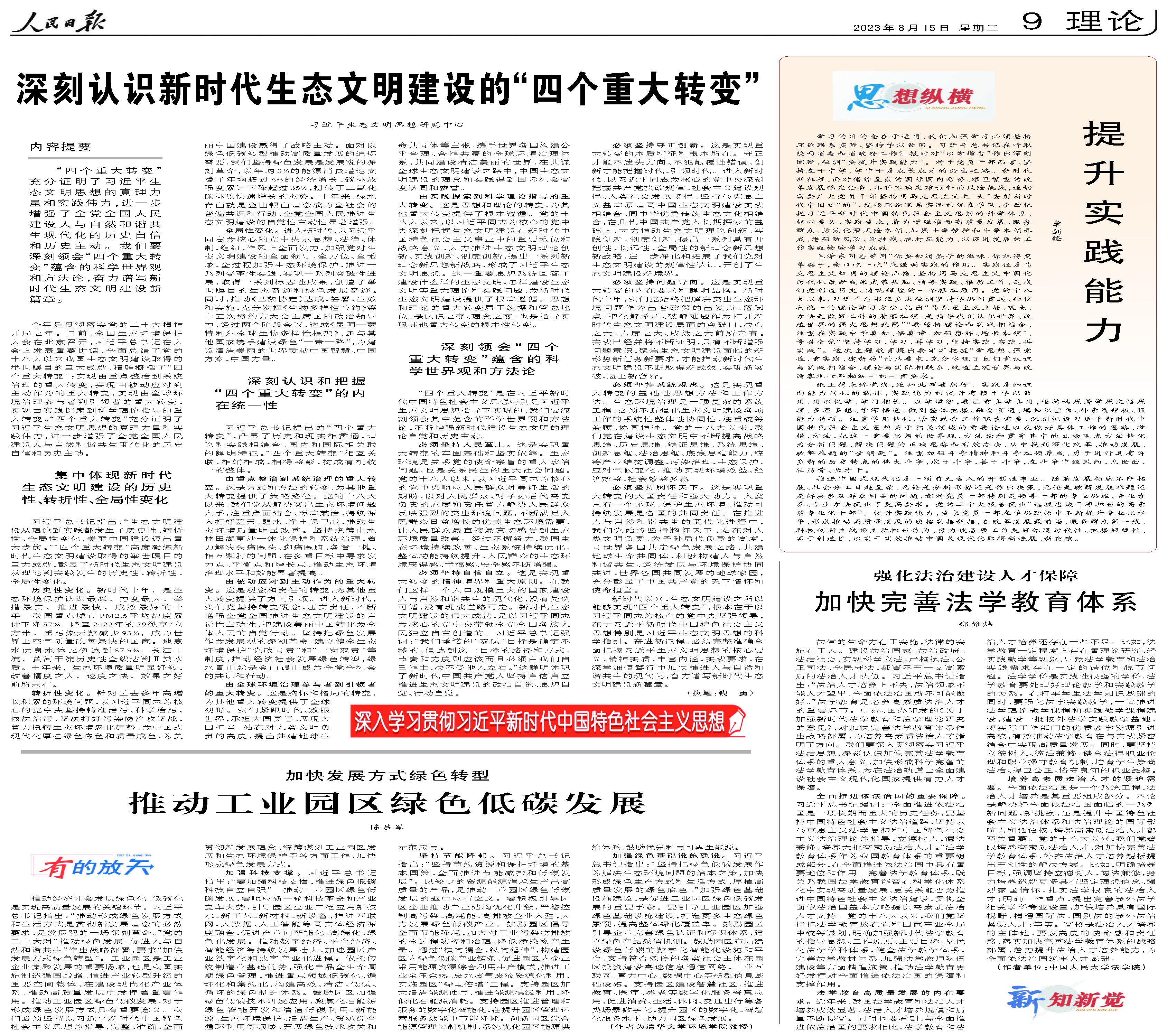 8月15日是全国首个生态日,环境学院陈吕军老师在人民日报理论版发表署名文章:加快发展方式绿色转型,推动工业园区绿色低碳发展。