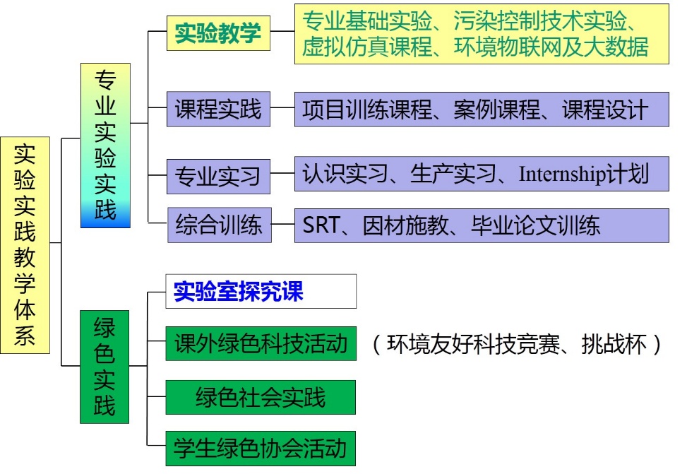 环境学院在多年的探索和实践中,逐步形成了结构清晰、内容丰富、目标明确、管理规范的新型实验实践教学体系,包括专业实验实践体系和绿色实践体系,见下图。
